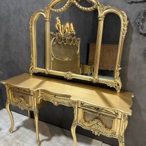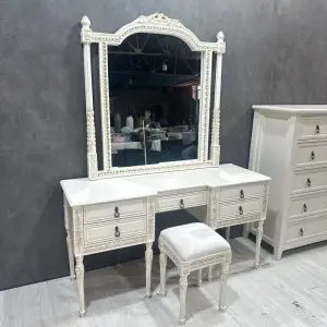 سرویس خواب کلاسیک دو نفره در فروشگاه مبل اشرافی شامل تخت خواب، میز آرایش، دو عدد پاتختی میشود. افزودن یا حذف هر کدام از اجزای سرویس خواب، کاملاً اختیاری و بر حسب نظر خریدار محترم تعیین میگردد.